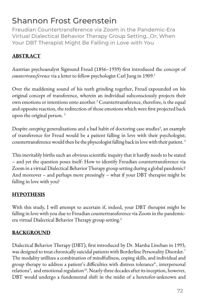 Freudian Countertransference via Zoom in the Pandemic-Era Virtual Dialectical Behavior Therapy Group Setting…Or, When Your DBT Therapist Might Be Falling in Love with You
