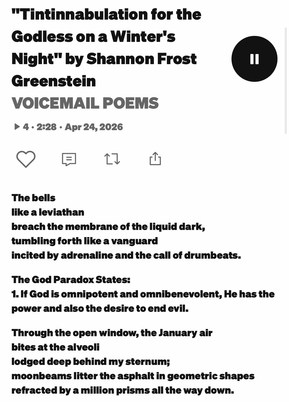 Shannon Frost Greenstein (She/They) resides near Philadelphia with her family and cats. She is the author of “Through the Lens of Time” (2026), a fiction collection with Thirty West Publishing, and “These Are a Few of My Least Favorite Things” (2022), a book of poetry from Really Serious Lit. Shannon is a former Ph.D. candidate in Continental Philosophy and a multi-time Pushcart Prize nominee. Her passions include Friedrich Nietzsche, anti-racism, ballet, the Seven Summits, the Hamilton Soundtrack, motherhood, and acquiring more cats. Find her at shannonfrostgreenstein.com or on Twitter and Bluesky at @ShannonFrostGre. Insta: @zarathustra_speaks; TikTok: @shannonfrostgreen